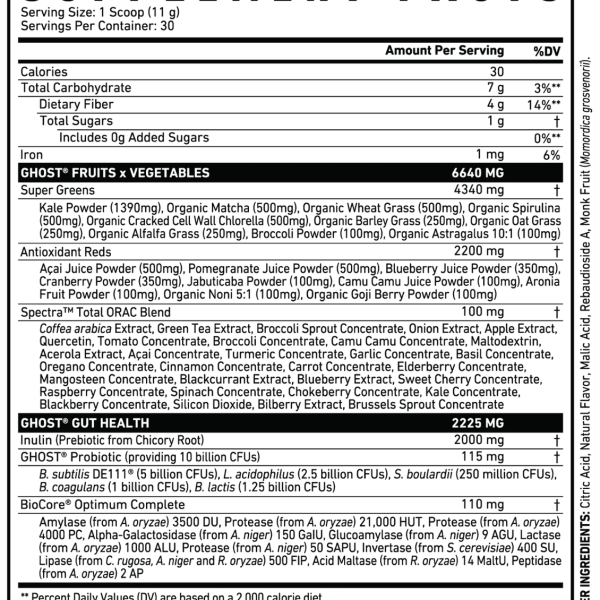 It’s easier than ever to get your fruits and veggies in! GHOST® GREENS combines 19 individually sourced Greens and Reds with a full 100mg dose of Spectra™, Prebiotics, 10 billion CFUs Probiotic and the super-premium BioCore® Optimum Complete Digestive Enzymes…plus, we’ve partnered with the legends at ONE TREE PLANTED to plant a tree for every unit sold. 1 Tub = 1 Tree!